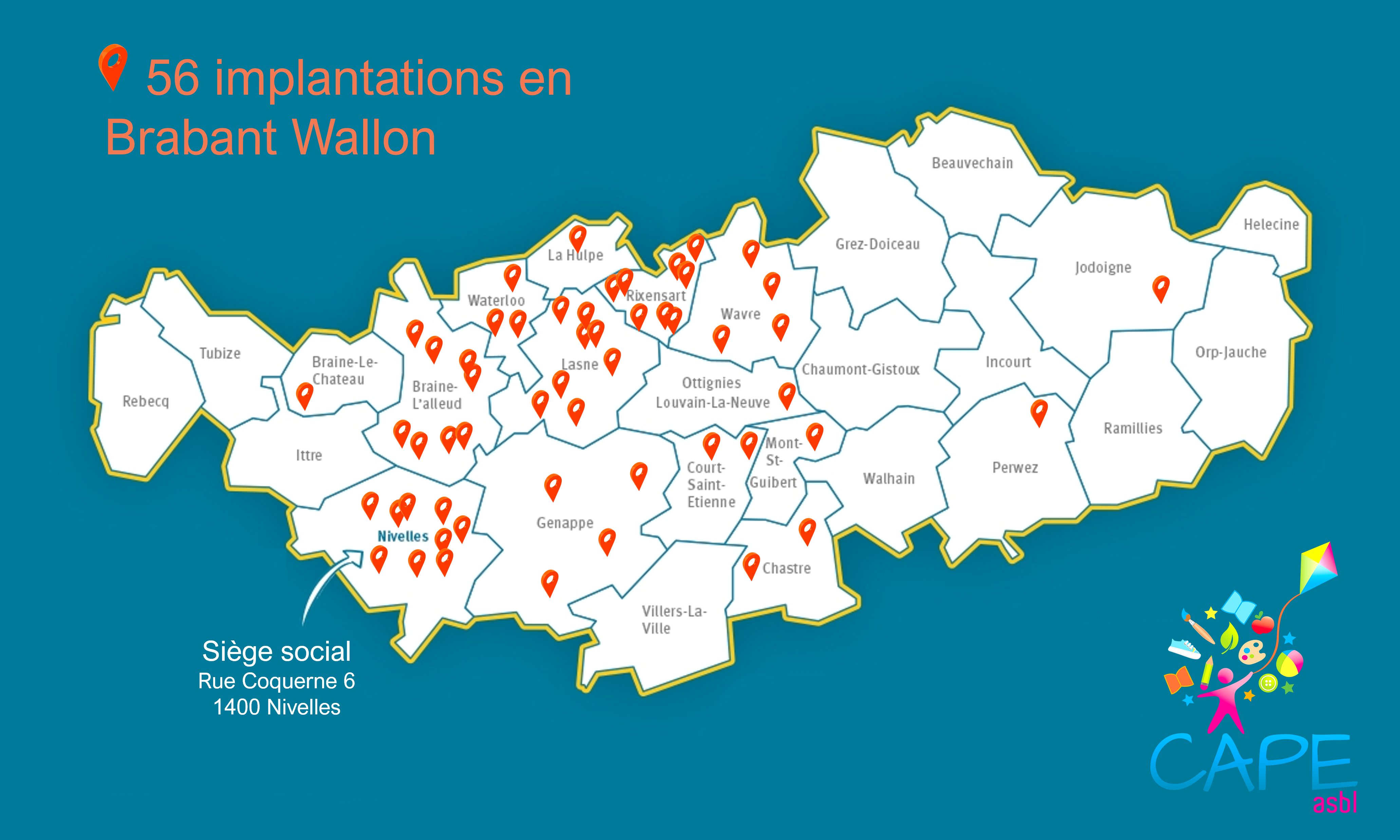 Nos animateurs sont présents dans 59 implantations en Brabant Wallon et 1 en Hainaut, où ils soutiennent les enseignants et encadrent les enfants à chaque moment de la journée : accueil du matin et/ou du soir, récréations, repas, sieste et activités à la piscine.